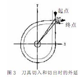 考慮刀具的進(jìn)、 退刀 ( 切入、 切出) 路線時, 刀具的切出或切入點(diǎn)應(yīng)在沿零件輪廓的切線上, 以保證工件輪廓光滑; 應(yīng)避免在工件輪廓面上垂直上、 下刀而劃傷工件表面; 盡量減少在輪廓加工切削過程中的暫停 ( 切削力突然變化會造成彈性變形) , 以免留下刀痕見圖 3。