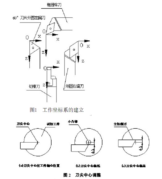 在工件坐標系建立之前, 還要考慮到車刀安裝后刀尖中心是否處于軸心位置的, 因此, 單把車刀的對刀包括:刀尖中心的高度調整和工件坐標系的建立兩個過程.