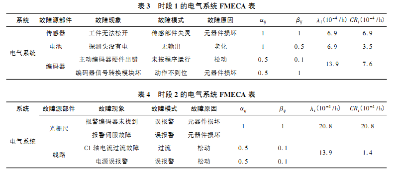 通過FMECA分析表能夠直觀地分析出哪種故障對 生產(chǎn)的危害度最大。由表3得出,時段1時的編碼器危害 度大于其他2項,是加工中心在時段1時最應(yīng)該加以防護 的危害。在時段2時,光柵尺危害度達到了 20. 8,是整個 系統(tǒng)中危害度最大的一項,而且都是因為光柵尺損壞造成 的,在日常維修工作中還需改善光柵尺選型及定期清理等 相關(guān)工作。從時段1和時段2的FMECA分析表中得出,2 個故障器的電氣系統(tǒng)常見故障危害度并不相同,這是因為 加工中心在不同的時間段里會表現(xiàn)出不同的故障,所以, 對加工中心不同故障時期的研究是有著重要的現(xiàn)實意義 及實用價值的。
