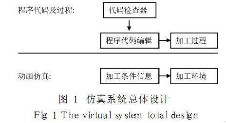 本文所研制仿真系統總體結構如圖 1所示,系統主要由程序代碼編輯、加工過程和動畫仿真兩大模塊組成. 代碼檢查器檢查錯誤,并通過編譯得出可執行數據,從而得到刀具軌跡,以此來驅動加工過程. 動畫仿真模塊由人機交互得到的加工條件等信息,并生成和顯示虛擬加工環境. 動畫仿真是整個系統的核心模塊.