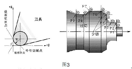 數(shù)控車床是按車刀刀尖對刀的,在實際加工中,產(chǎn)生磨損及精加工時車刀刀尖磨成半徑不大的圓弧刀的刀尖不可能絕對尖,總有一個小圓弧,所以對刀尖的位置是一個假想刀尖『,如圖所示,編程時是按假想刀尖軌跡編程,即工件輪廓與假想刀尖『重合,車削時實際起作用的切削刃卻是圓弧各切點.這樣就引起加工表面形狀誤差、