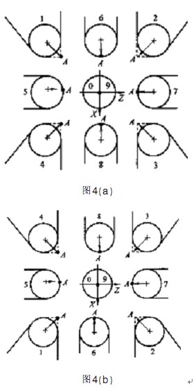 根據(jù)車刀的形狀確定位置參數(shù),數(shù)控車削使用的刀具有很多種,不同類型的車刀其刀尖圓弧所處的位置不同,如圖所示〔)將車刀的形狀和位置用刀尖方位參數(shù)T來表示,A點為假象的刀尖點,刀尖方位參數(shù)共有8個(n -g) >當使用刀尖圓弧中心編程時,可以選用。或9})圖(a)為刀架前置的數(shù)控車床假象刀尖的位置;圖((b)為刀架后置的數(shù)控車床假象刀尖的位置、