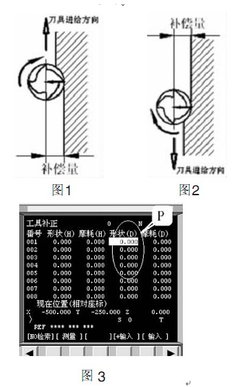 在編程時,使用非零的D##代碼( DO1-D32)選擇正確的刀具偏置寄存器寫,其偏置m:(即補償值放在如圖3相對應f的位置)的大小通過CRT/MDl操作而板在對應的偏置寄存器寫中設定、在粗加下時,將補償伯設為D-R+O,其中R為刀具的半徑,△為精加下余m:,這樣在粗加下完成后,形成的下件輪廓加下尺寸理論上要比實際輪 廓每邊都大△、在精加下時,通 圖3過測m:伯設定補償值,這樣,零件加下完成后,即可得到實際加下輪廓,如圖3所示、