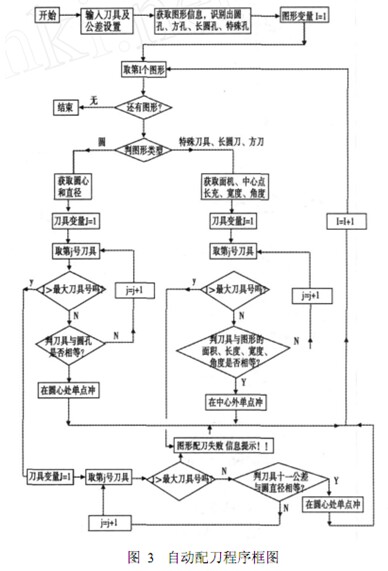 利用循環(huán)原理 ,把實(shí)體數(shù)組中的圖素全部處理后 ,在 CAM層上就自動(dòng)把合適的刀具適配上了 , CAM圖形為了區(qū)別于 CAD圖形 ,以特殊的顏色顯示 ,放在專用層上 ,以便于后續(xù)處理。由于篇幅所限 ,在這里只能給出程序框圖圖 3。