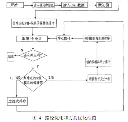 該優(yōu)化方法采用分組方式 ,每?jī)擅诪橐唤M ,每組內(nèi)先按模具優(yōu)化 ,相同模具按沖點(diǎn)的 X值 +所用模具的偏移值的距離進(jìn)行優(yōu)化 ,相同模具并且 X值 +所用模具的偏移值也相同的沖點(diǎn)按 Y值+所用模具的偏移值的距離進(jìn)行比較 ,再按所有優(yōu)化路徑進(jìn)行比較 ,選出一個(gè)最佳路徑生成 NC代碼。