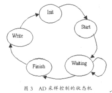 ( 2)AD采樣狀態(tài)機(jī)模塊: 完成 AD采樣控制, 將采到的數(shù)據(jù)存入 RAM中。狀態(tài)機(jī)的一個(gè)采樣周期設(shè)計(jì)為五個(gè)狀態(tài):