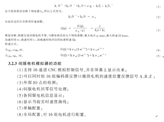 伺服模擬器的各個(gè)參數(shù)是從各種不同種類的伺服電參數(shù)中抽取出來的, 這一特性實(shí)現(xiàn)了對(duì)各種不同型號(hào)的伺電機(jī)的模擬。除此之外, 伺服模擬器還可以對(duì)系統(tǒng)極端情下臨界值進(jìn)行測試, 解決了真實(shí)伺服電機(jī)測試臨界值的題。其中在伺服電機(jī)的控制性能方面, 模擬器的隨動(dòng)誤差真實(shí)電機(jī)相當(dāng)。伺服模擬器實(shí)現(xiàn)了對(duì)伺服電機(jī)的真實(shí)模數(shù)控系統(tǒng)在控制伺服模擬器時(shí)無法分辨連接的是模擬器是伺服電機(jī)。