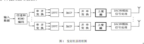 圖1為采用了MIMO2OFDM編碼調(diào)制技術(shù)的數(shù)字電臺(tái)的發(fā)射機(jī)結(jié)構(gòu)框圖 ,上變頻模塊的位置為圖中粗框黑體字所示。由于是多天線(xiàn)傳輸 ,信源先分解成分路信號(hào) ,分別通過(guò)編碼器(包括了信道編碼和空時(shí)編碼) 、 OFDM調(diào)制器后變成待發(fā)基帶信號(hào) ,最后經(jīng)過(guò)上變頻模塊將中心頻率搬移到射頻 ,傳輸?shù)蕉嗵炀€(xiàn)。