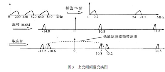 為描述直觀(guān)方便,本文仿真中擬定一組數(shù)據(jù)作為參考值。假定輸入的基帶信號(hào)帶寬為 200kHz ,采樣率為320kHz ,內(nèi)插系數(shù)定為 75 倍 ,則插值濾波后的采樣率變?yōu)?/span> 24MHz , 設(shè)定正交載頻頻率為10. 6MHz。這組參考值下的頻譜變換圖如圖3所示。根據(jù)系統(tǒng)運(yùn)算量估計(jì)和成本預(yù)算 ,最終選用CYCLONE II系列 EP2C8T144芯片實(shí)現(xiàn)。