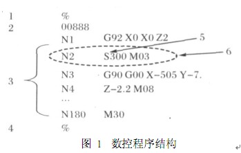 一個完整的數控加工程序由若干程序段組成 ,而數控程序段又由若干條數控指令按照一定的結構構成。數控程序結構如圖 1所示。