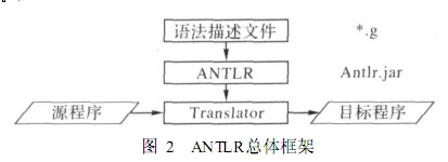 ANT LR總體框架如圖 2所示。在使用 Antlr時 ,要先創建一個稱為語法文件的文本文件 (. g文件 ) , 將自定義的詞法分析器和語法分析器的規則全部寫在里面。Antlr就是通過讀取分析語法文件中的規則來生成詞法分析器與語法分析器的。Antlr語法文件的工作過程如下:首先 ,定義詞法分析器 Lexer類 ,在類中定義各種 Token;然后 ,定義語法分析器Parser類 ,在類中使用 EBNF語法 ,遞歸定義各種句子 , Parser類負責把讀入的 Token串匹配成句子 ,翻譯出 AST(抽象語法樹 ) ;最后 ,定義用于處理 AST的 TreeParser類 ,根據 Parser類分析出來的 AST(抽象語法樹 )進行動作。Antlr語法文件具體組成部分及規則解析參見文獻 [ 6 ]。