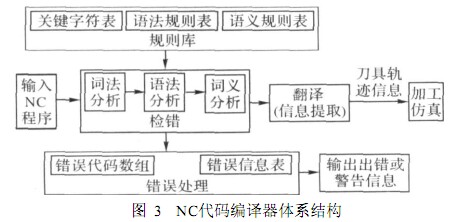數控 NC代碼驅動機床運動實現加工的自動化 ,能夠大大提高加工性能。但不正確的 NC代碼會造成過切或欠切加工出廢品 ,也可能發生零件與刀具、 刀具與夾具、 刀具與工作臺之間的干涉碰撞 ,這顯然十分危險。因此 ,迫切需要一種虛擬的仿真加工平臺來檢驗 NC代碼的正確性 ,NC代碼編譯器是組成數控虛擬仿真平臺的核心部分之一。