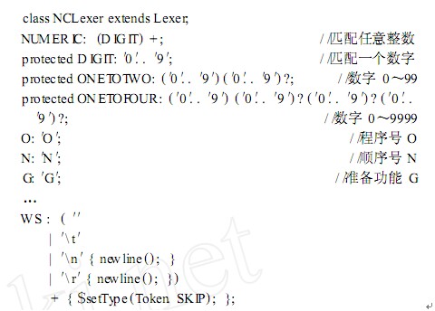 對數控程序的源代碼進行格式整理的主要任務是刪除數控程序中的空白字符、 回車符、 程序注釋等非加工信息字符 ,并將數控程序轉換成便于代碼編譯程序進行處理的內部格式。在 ANT LR定義的. g語法文件中通過下面的代碼來實現詞法分析器的功能。