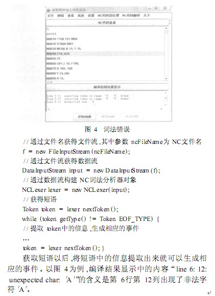 數控程序中出現非法字符主要指以下兩種情況:第一種情況為含有系統無法識別的字符。在本編譯系統中 ,系統可識別的字符集為 { G, X, Y, Z, H, D, F, O, N, I , J, K,M, S, T,R. , ; , % } ,阿拉伯數字 0~99,若數控程序內出現“A” 等字符集所不包含的字符時 ,則認為數控程序含有非法字符。第二種情況是由系統可識別字符集組成的系統無法識別的字符串。這種錯誤一般是由于用戶的誤操作造成的 ,包括以下兩種: 1)沒有相應的數控功能與字符串相匹配 ,如“7100” ,“M890” ,“MFO 1” 等均屬于這種情況; 2)數值格式輸入有誤 ,如 150正確的表達應為“150 . ” ,但若用戶在中間輸入空格則變成“1 5 0 . ” ,這種情況在本編譯系統中也被視為是數值格式輸入錯誤的一種。