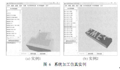 數控語法分析模塊的任務是在詞法分析基礎上將數控加通過線程及 Java 3D 對動畫效果、 交互式操作、 形體組合、復雜的應用程序的支持等來實現仿真 (模型顯示于界面右部 ) ,并可通過按鈕和菜單對仿真的過程進行控制。圖 6為系統運行實例。