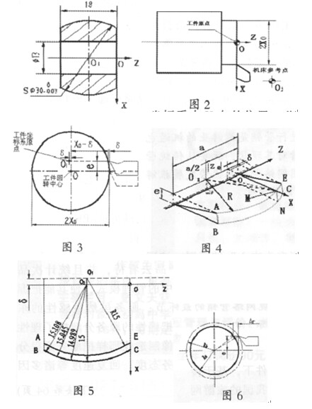 顯然, 弧 CB 部分的實際軌跡不是圓弧。由圖 5 的一組標注尺寸也可以看出實際加工出的曲線弧 CB 上各點到球面中心 O2 的距離不是定值(以圖 1 為例), 因此弧 CB為非圓弧曲線, 也即車削后的零件不是標準球面, 其形狀存在誤差。