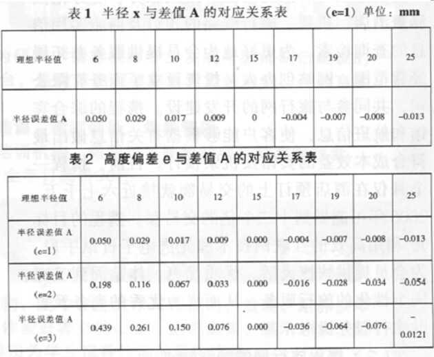 由表 2 可以看出, 隨高度偏差 e 值的增徑向誤差 A 的絕值也隨之增大。零件截面半徑小對刀尺寸時,實際工尺寸仍然偏大半徑越小,徑向誤值越大; 當截面徑大于對刀尺寸實際加工尺寸仍然偏小,且半徑越大, 徑向誤差的絕對值越大。當零件截面半徑等于對刀測量徑時徑向尺寸誤差為零。