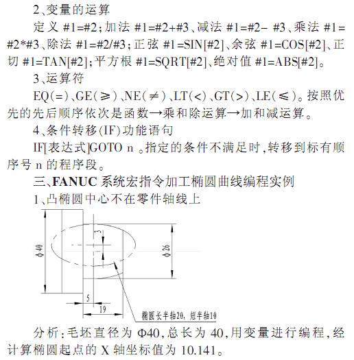 以上介紹了橢圓在實(shí)際加工中的編程方法 其實(shí)在用宏程序編制橢圓程序時(shí) 首先能夠選對(duì)變量和寫出正確的方程通過(guò)方程計(jì)算出另一變量 其次能正確確定工件原點(diǎn)與橢圓中心之間的關(guān)系 再編出正確的橢圓宏程序 實(shí)踐工作中遇到具體的加工實(shí)例要具體分析 不能硬套固定模式 要多方面綜合考慮 合理運(yùn)用宏指令進(jìn)行編程