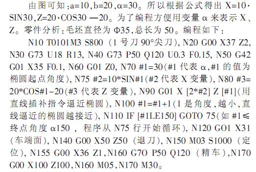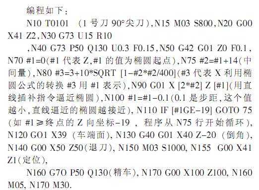 橢圓加工 普通機(jī)床很難完成 而數(shù)控機(jī)床確能夠輕松的加工出來(lái) 主要是因?yàn)闄E圓加工的時(shí)候 X Z 兩坐標(biāo)是同時(shí)變化的 數(shù)控機(jī)床是通過(guò)程序控制的方式來(lái)驅(qū)動(dòng)兩軸 實(shí)現(xiàn)兩軸的共同運(yùn)動(dòng) 但數(shù)控車床只具有直線插補(bǔ)和圓弧插補(bǔ)兩種基本插補(bǔ)功能 不具備橢圓插補(bǔ)功能 所以加工橢圓時(shí)可以采用直線逼近法的方式進(jìn)行加工 即把曲線用許多小段的直線來(lái)代替 無(wú)限接近橢圓輪廓的加工方法 下面選用 FANUCOiTC 數(shù)控車削系統(tǒng) 結(jié)合工作實(shí)踐談?wù)勅绾吻捎煤瓿绦蚪鉀Q橢圓編程問(wèn)題