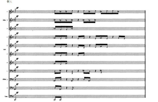著作開端到 19 號完畢的方位為榜首有些, 在這一有些中首要有三段構(gòu)成, 而榜首段是由五個獨立的旋律構(gòu)成, 他們分別由圓號、 低音單簧管、 單簧管、 雙簧管和長笛來演奏, 之后的第二、三段與榜首段比較則是改變了各聲部進入的次第和時刻。而在全部榜首有些中弦樂聲部首要是以長音的辦法演奏和聲。 從著作20 號開端到 40 號是全部著作的第二大有些, 旋律也改變?yōu)槲逡粢袅泻退囊粢袅薪惶孢\用。而擔任織體功用的弦樂則選用撥弦的辦法演奏, 這都與榜首有些構(gòu)成了比照聯(lián)系。從著作 40 號開端到44 號完畢 (管樂有些) 是該曲的第三有些, 在這一有些中作者首要運用長音的辦法, 由開端構(gòu)成較寬的音區(qū) (#G——g) 逐步縮減到小三度的規(guī)模 (#g——b) 。盡管這一有些中并沒有明確地再現(xiàn)之前榜首有些中的旋律, 可是管樂聲部運用長音和弦的辦法與榜首有些中弦樂聲部運用長音和弦的辦法一樣, 這些要素都表現(xiàn)了必定的再現(xiàn)功用。 從著作 43 號的弦樂聲部開端到最終是著作的結(jié)尾有些, 這一有些與之前第三有些的最終構(gòu)成疊入聯(lián)系。