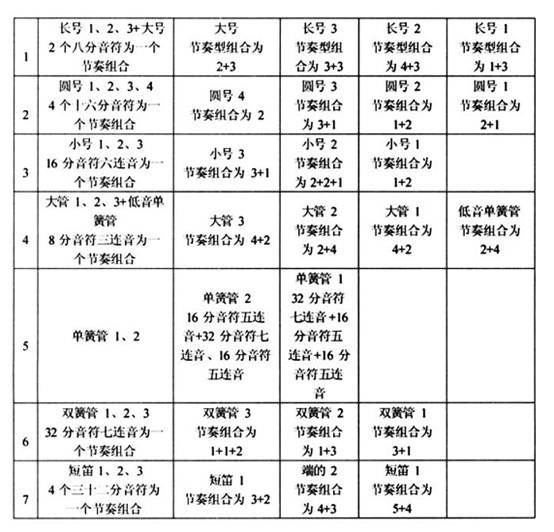 通過上例我們可以觀察到, 各聲部除了開始是一個二分音符外, 之后的節(jié)奏型主要有四種, 分別為四音組、 三音組、 二音組和一音組, 每個音組之間用休止符隔開, 按照不同的樂器組,由高到低依次遞減。