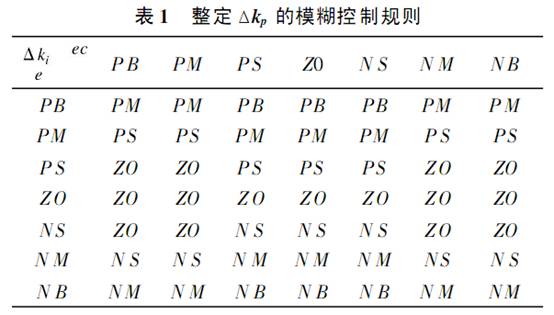 自適應(yīng)模糊控制器采用e 和ec 為輸入語言變量, $ kp 為輸出語言變量, e 和ec、 $ kp 的模糊集均為{N B, NM, N S, ZO, P S, PM, PB } , 論域均為{ - 6,- 5, - 4, - 3, - 2, - 1, 0, 1, 2, 3, 4, 5, 6} ,隸屬函數(shù)均為三角函數(shù),整定 $ kp 的模糊控制規(guī)則如表一.針對不同的控制偏差e 和偏差的變化率ec, 歸納出 $ kp 的整定原則: