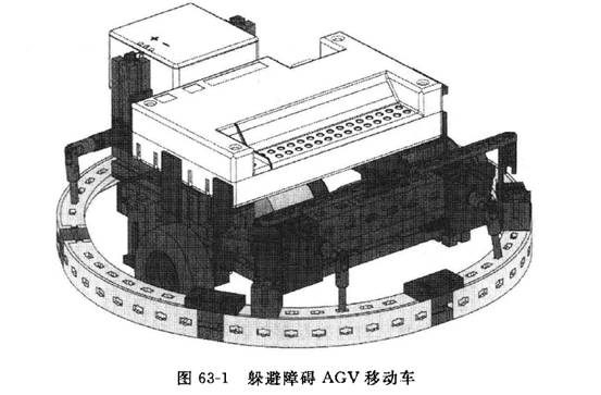 躲避障礙AGV移動(dòng)車(chē)見(jiàn)圖63-1,能夠在前方遇到障礙時(shí)自動(dòng)躲避并改變前進(jìn)方向。躲避障礙AGV移動(dòng)車(chē)由行走機(jī)構(gòu)、障礙檢測(cè)裝置、智能接口板和電源組成。該AGV移動(dòng)車(chē)使用下列輸人輸出設(shè)備:2個(gè)電動(dòng)機(jī),用于控制移動(dòng)車(chē)左右車(chē)輪的運(yùn)轉(zhuǎn),控制移動(dòng)車(chē)的行走;2個(gè)按鈕開(kāi)關(guān)與凸輪配合作為旋轉(zhuǎn)編碼器使用產(chǎn)生脈沖信號(hào),分別控制所對(duì)應(yīng)左右車(chē)輪轉(zhuǎn)速;在移動(dòng)車(chē)左前方、右前方和正后方裝有限位開(kāi)關(guān),用于檢測(cè)障礙物的方向,并發(fā)出信號(hào)。行走機(jī)構(gòu)由兩個(gè)主動(dòng)輪和一個(gè)無(wú)動(dòng)力的輔助輪組成,均安裝在車(chē)架上。電源和智能接口板安裝在車(chē)架上部。