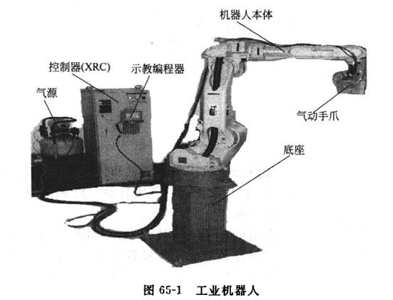 UP-6工業(yè)機(jī)器人具有六自由度,該設(shè)備主要由機(jī)器人本體、控制器(XRC)、示教編程器、氣動(dòng)手爪、底座和氣源等部分組成,工業(yè)機(jī)器人組成見(jiàn)圖65-1 e