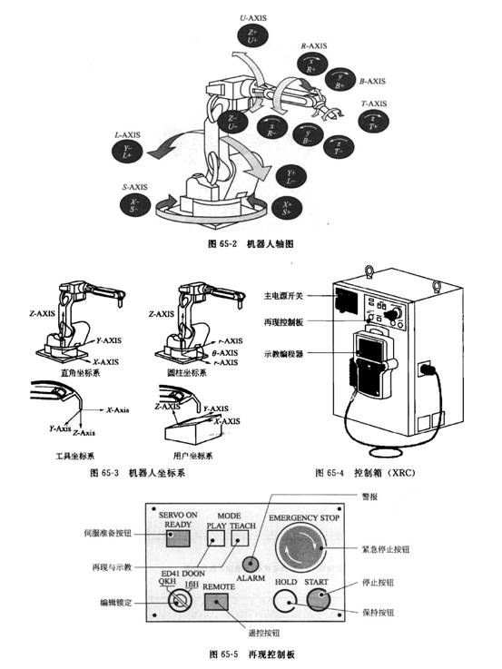 ②示教編程器示教編程器見(jiàn)圖65-6,其上設(shè)有用于對(duì)機(jī)器人進(jìn)行示教和編程時(shí)所需要的操作鍵,用于對(duì)機(jī)器人的工作軌跡和參數(shù)設(shè)定,以及所有人機(jī)交互操作,擁有自己獨(dú)的CPU以及存儲(chǔ)單元,與主計(jì)算機(jī)之間以串行通信方式實(shí)現(xiàn)信息交互。