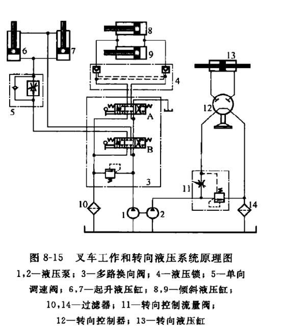 當(dāng)多路換向閥3的起升閥A和傾斜閥B均處于中位時(shí),液壓泵1的出油直接回油箱,系統(tǒng)卸荷,工作裝置處于待機(jī)狀態(tài),不能進(jìn)行貨叉起升和門(mén)架傾斜操作。