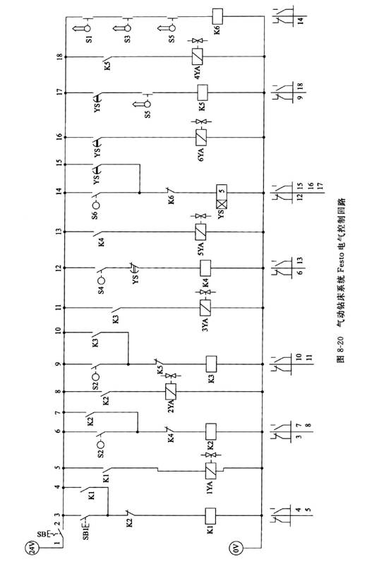 整個氣動系統就是對三個缸的控制,由于氣缸往復頻率較高,因而選擇緩沖氣缸,同時利用行程開關控制氣缸到達行程終點時的預定換向動作。主控閥采用三位五通雙電控先導式電磁閥,氣缸速度通過單向節流閥來調節;為使氣缸快速排氣,加快氣缸運動速度,設置了快速排氣閥;回路中設置的二位二通行程閥是為了實現鉆削缸快進和工進的換接,且可使換接平穩。氣動鉆床電氣控制回路如圖8-20所示。