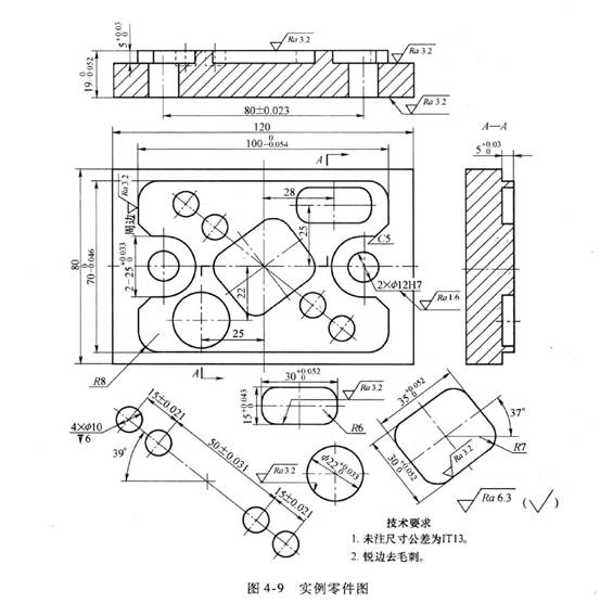 如圖4-9所示,零件外形規(guī)則,被加工部分的各尺寸、形位、表面粗糙度等要求較高。圖中包含了平面、內(nèi)外輪廓、挖槽、鉆孔、鉸孔及銑孔等加工,且大部分的尺寸均達(dá)到IT8一I1"7級(jí)精度。