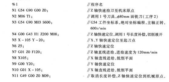 工序1銑削平面在MDI方式下完成,不必設(shè)置坐標(biāo)系。在執(zhí)行加工工序2之前要進(jìn)行對(duì)刀,將刀具送人刀庫(kù)(對(duì)號(hào)人座)并設(shè)置工件坐標(biāo)系以及補(bǔ)償?shù)葏?shù),