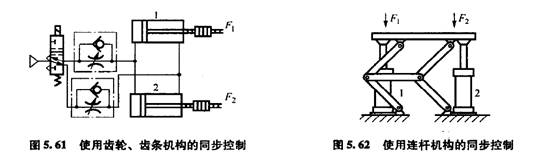 將兩只氣缸的活塞桿通過機(jī)械結(jié)構(gòu)連接在一起,從理論上可以實(shí)現(xiàn)最可靠的同步動(dòng)作。圖5. 61所示的同步裝置使用齒輪、齒條將兩只氣缸的活塞桿連接起來,使其同步動(dòng)作。圖5. 62所示為使用連桿機(jī)構(gòu)的氣缸同步裝置。對于機(jī)械連接同步控制,其缺點(diǎn)是機(jī)械誤差會影響同步精度,且兩只氣缸的設(shè)置距離不能太大,機(jī)構(gòu)較復(fù)雜。