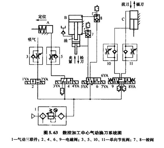 圖5. 63為數(shù)控加工中心氣動(dòng)換刀系統(tǒng)原理圖,