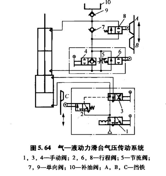 ①慢退(反向進給)當(dāng)慢進至擋鐵C切換行程閥2至左位時,輸出氣信號使閥3切換到左位,汽缸活塞開始向上運動,這時液壓缸活塞上腔的油液經(jīng)行程閥8的左位和節(jié)流閥
