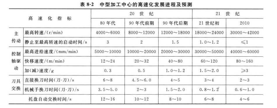 滾珠絲杠的疾速進結速度可達40一60m/mtH,直線電機的疾速進給速度高達90一120m/min。此外,高速機床的主抽和作業臺還要具有杰出的加速度功能,主軸從啟動到最高轉速的時刻只用1—2s,作業臺的加速度到達lf一105。表8—1列出了這些年國際上幾種高速機床的首要產品和標準。