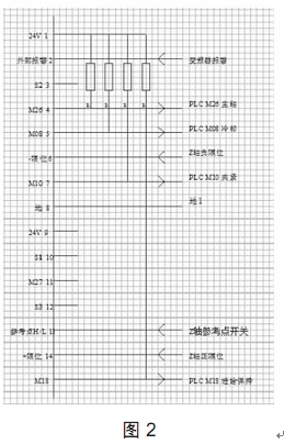 (2)與 PLC不能直接連接,需要通過上拉電阻的方式實現(xiàn)改造后的系統(tǒng)使用的是歐姆龍的 PLC,沒有內(nèi)置 24 V電源,且需要的輸入信號是較小的電壓信號 而大地數(shù)控系統(tǒng)輸出的信號是開關(guān)信號,接入 24 V電源后,通過上拉電阻的方式才能實現(xiàn)與其通訊,見圖2