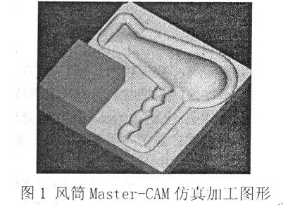 MasterCAM 軟件是基于微機(jī)平臺最經(jīng)濟(jì)、 最有效的CAD/CAM 集成軟件, 側(cè)重于數(shù)控加工, 在零件加工和模具制造中應(yīng)用非常廣泛.MasterCAM 具有很強(qiáng)的數(shù)控自動編程能力, 應(yīng)用軟件本身內(nèi)嵌的后置處理器可實(shí)現(xiàn)簡單及復(fù)雜模型的自動編程, 針對不同的數(shù)控系統(tǒng)不同的加工模塊 ( 如車削、 銑削、 線切割等)都具有相對應(yīng)的后置處理文件[ 4 ].MasterCAM 銑削模塊系統(tǒng)缺省的后處理文件為MPFAN. PS T , 適用于FANUC 系統(tǒng)數(shù)控代碼的控制器.在利用KXK7250 加工中心 ( 數(shù)控系統(tǒng)為北京KND100M)進(jìn)行實(shí)際加工時,也應(yīng)該選擇相應(yīng)的后處理程序, 用缺省的后處理程序時, 輸出的NC 文件不能直接用于加工.所以需要對MPFAN. PS T 文件進(jìn)行修改, 使之適合于KXK7250 加工中心的后置處理程序.圖1 為風(fēng)筒模型Master-CAM軟件仿真加工圖形