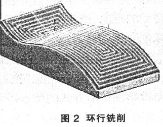 ( 2) 環(huán)行銑削( 圖 2) 。這種切削方式是同時對多張曲面進行加工的計算方法, 其走刀路線是以外輪廓的形狀由外向內(nèi)(或由內(nèi)向外)進行走刀, 是最常用的走刀方式之一。