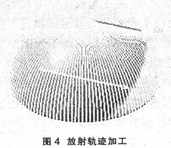 ( 4) 放射軌跡加工 ( 圖 4) 。放射狀加工( Radial) 策略通常用于對稱且加工紋理有特殊要求的場合, 它在靠近中心的位置刀具軌跡密集重疊, 故對于刀具軌跡延伸至中心的模型, 其加工效率不高, 其總體加工時間比采用平行加工策略約多出 20%~30%, 故只用于如球面、 環(huán)形圓弧面區(qū)域等對于刀具加工紋路有特殊要求的加工區(qū)域。