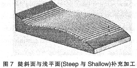 ( 7) 陡斜面與淺平面(Steep 與 Shallow)補充加工( 圖 7) 。加工之前首先分析計算曲面斜度, 將曲面斜度大于某一設(shè)定值的曲面定為陡斜面, 反之為淺平面。該方法可以測定并補充加工由平行加工及 Z向等距加工后的殘留高度過大的曲面區(qū)域。在圖 7中, 曲面斜度設(shè)為 30°, 所以曲面角度小于 30°的才進行補充加工。