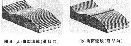 ( 8) 曲面流線( Flow- line) 加工( 圖 8) 。刀具軌跡沿某曲面的曲面坐標(biāo)系的 U向或 V向的曲面流線方向生成, 可以得到沿曲面伸展的特定的加工軌跡。