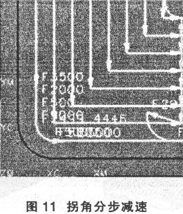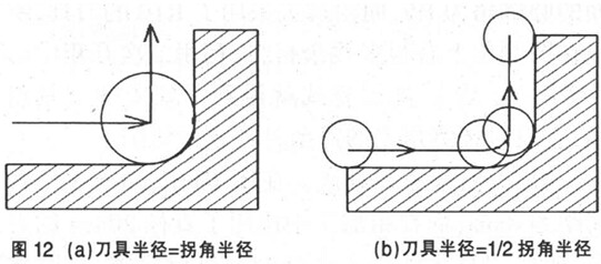 在數(shù)控高速切削加工中, 刀具軌跡拐角的處理是十分重要的, 因為即使切削深度很淺, 進給速度和走刀軌跡的劇烈變化也是造成刀具破損的重要原因之一。 為避免這種情況, 應(yīng)調(diào)整進給速度, 從而調(diào)整每一個刀刃的切削量( 圖 11) , 在圖中的拐角處, UG NX3.0 采用了分步減速的方法。同時要避免刀具軌跡的劇烈變化( 圖 12) , 圖中的圓角如果用等半徑的刀具直接加工, 如圖 4- 12 ( a) 所示, 則進給方向發(fā)生突變勢必會使機床負荷猛然增加, 所以, 加工這種類型的圓倒角最好是使用較小半徑的刀具, 一般情況下刀具半徑最好為圓倒角幾何尺寸的 70%或更小, 這樣可使拐角處的切削刀具進給方向變化平滑, 避免刀具的突然轉(zhuǎn)向, 見圖 4- 12b) 。使用小直徑刀具加工和直接切入拐角相比,機床負荷可以降低 3 倍左右。